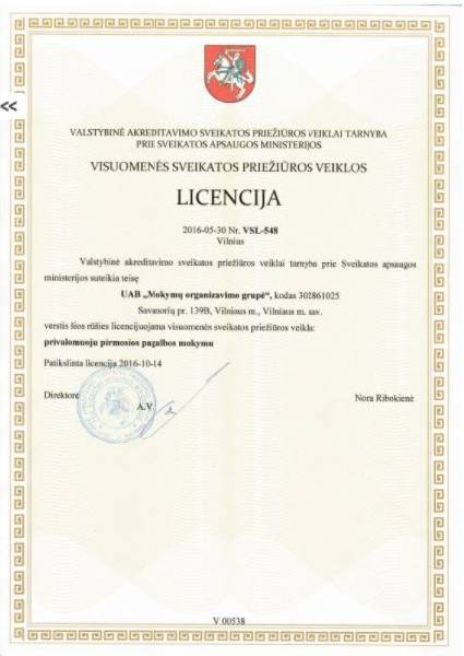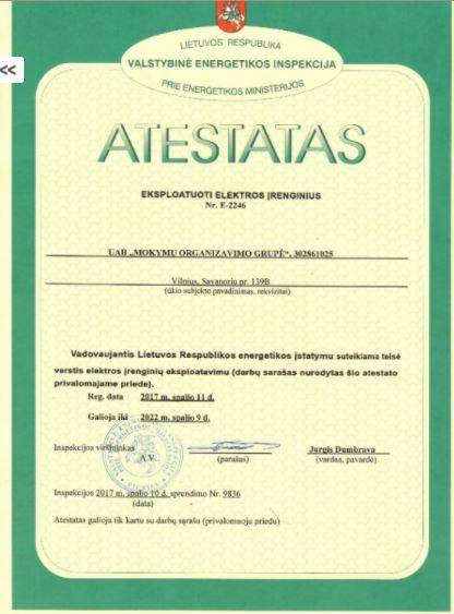 Veiklos aprašymas: Mokymų organizavimo grupė siūlo sprendimus, susijusius su jūsų darbuotojų mokymais, darbuotojų kvalifikacijos kėlimu ir tobulėjimu, personalo, vadovų atestavimu, sudaro galimybes papildyti anksčiau įgytas žinias. Pagrindinės mokymų sritys: - SPSC ypatingųjų statinių kvalifikacijos atestatai; - Energetika ( elektros, šilumos ūkio, dujų ir naftos įmonių darbuotojų mokymas); - Transportas (profesinis vairuotojų mokymas (95 kodas), krautuvų vairuotojų mokymas, autoserviso personalo mokymas); - Darbuotojų sauga ir sveikata (specialistų, atsakingų asmenų, vadovų mokymas); - Vadyba (administracijos darbuotojų, pardavėjų,vadybininkų, klientų aptarnavimo specialistų mokymas); - Kvalifikacijos kėlimo seminarai pagal LR Aplinkos ministerijios reikalavimus; - Valstybės tarnautojų mokymas; - Kitas mokymas. Pagrindinės paslaugos: - Pilnas įmonės darbuotojų saugos ir sveikatos, gaisrinės saugos ir saugos nuo elektros auditas; - Įmonės darbuotojų saugos ir sveikatos tarnybos funkcijų vykdymas; Darbuotojų saugos ir sveikatos dokumentacijos rengimas; - Specialisto, atsakingo už įmonės elektros ūkį funkcijų vykdymas; - Reikalingų žurnalų, blankų, ženklų asmeninių apsaugos priemonių teikimas; - Įmonės vadovų ir darbuotojų konsultavimas.