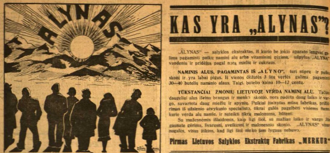 ![]() Tema: Senos reklamos Metai: 1931 Šaltinis: „Mūsų laikraštis“ Tekstas: Alynas “Alynas” – salyklo ekstraktas, iš kurio be jokio aparato lengvai galima pagaminti puikų naminį alų arba vitamininį gėrimą, užpylus “Alyną” vandeniu ir pridėjus pagal norą mielių ir cukraus. Naminis alus, pagamintas iš „A L Y N O“, turi stiprų ir puikų skonį ir yra labai pigus. Iš vienos dėžutės 3 litų vertės galimu pagaminti 30—40 butelių naminio alaus. Taigi, butelio kaina 10—12 centų. Tūkstančiai žmonių Lietuvoje verda naminį alų. Tačiau daugeliui alus išeina brangus ir menko skonio, nors padėta daug laiko ir vargo, suvartota daug miežių ir apynių. Su mažesnėmis išlaidomis kaip ligi šiol, su mažiau laiko ir vargo, Jūs gaunate gėrimą, švaresnį, sveikesnį ir malonesnio skonio. “Alynas” visur nugalės, visus įtikins, kad ligi šiol nieko jam lygaus nebuvo. Daugiau senų reklamų | Senos Vilniaus nuotraukos Kitos senos reklamos