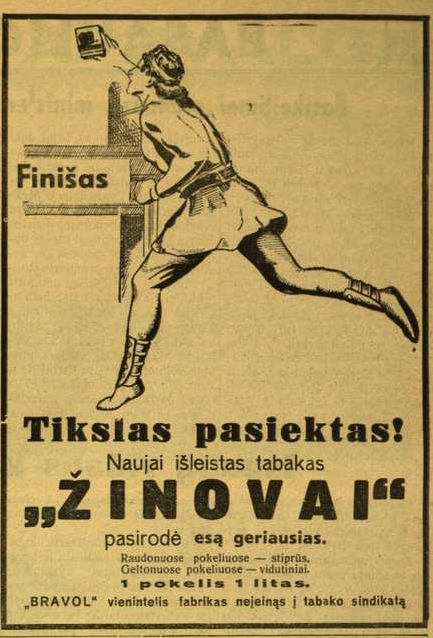 ![]() Tema: Senos reklamos Metai: 1938 Šaltinis: „Lietuvos ūkininkas“ Tekstas: Tikslas pasiektas! Naujai išleistas tabakas „Ž I N O V A I“ pasirodė esą geriausias. „Bravol“, vienintelis fabrikas, neįeinąs į tabako sindikatą. Daugiau senų reklamų | Senos Vilniaus nuotraukos Kitos senos reklamos