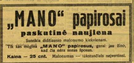 ![]() Tema: Senos reklamos Metai: 1936 Šaltinis: „Lietuvos ūkininkas“ Tekstas: „MANO“ papirosai paskutinė naujiena Suteikia didžiausio malonumo kiekvienam. Tik kas mėgina „MANO“ papirosus, gerai jau žino, kad čia nėra senas šposas. Kaina - 25 cnt. Malonumas — tūkstančiais neįvertinsi. Daugiau senų reklamų | Senos Vilniaus nuotraukos Kitos senos reklamos