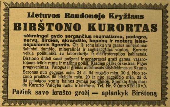 ![]() Tema: Senos reklamos Metai: 1935 Šaltinis: „Lietuvos ūkininkas“ Tekstas: Lietuvos Raudonojo Kryžiaus BIRŠTONO KURORTAS sėkmingai gydo sergančius reumatizmu, podagra, nervų, širdies, skrandžio, kepenų ir moterų įsisenėjusiomis ligomis. Čia iš senų laikų yra garsūs mineraliniai šaltiniai, dumblo, mineralinės Ir angliarūgštės vonios, Kurorte veikia poliklinika su laboratorija ir elektroterapijos kabinetais. Birštono dideli sausi pušynai ir nepaprastai graži gamta vasarotojams teikia ramų ir malonų poilsį. Kasdien parke orkestras. Pigus pragyvenimas. Patogus ir greitas autobusais susisiekimas su Kaunu. Sezonas nuo gegužės mėn. 24 d. iki rugsėjo mėn. 30 d. Nuo sezono pradžios iki birželio mėn. 20 ir nuo rugpjūčio mėn. 25 d. iki pabaigos vonių kainos žymiai papigintos. Smulkių žinių duoda Kurorto Valdyba raštu ir telefonu. Tel. Nr. 9 (nuo 9 iki 10 v.). Pažink savo krašto grožį — aplankyk Birštoną Daugiau senų reklamų | Senos Vilniaus nuotraukos Kitos senos reklamos