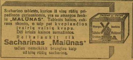 ![]() Tema: Senos reklamos Metai: 1934 Šaltinis: „Lietuvos ūkininkas“ Tekstas: Sacharino tabletės, kurios iš visų rūšių pripažintos geriausiomis, yra su atsargos ženklu „MALŪNAS“. Tabletės baltos, cukraus skonio, o taip pat k v e p i a n č i o s įvairių vaisių kvapu. Dėl krizės kainos sumažintos. Reikalaukit tik Sacharinas „Malūnas“ tačiau nemokėkit brangiau kaip už kitų rūšių sachariną. Daugiau senų reklamų | Senos Vilniaus nuotraukos Kitos senos reklamos
