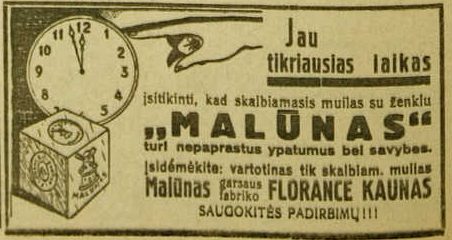 ![]() Tema: Senos reklamos Metai: 1930 Šaltinis: „Lietuvos ūkininkas“ Tekstas: Jau tikriausias laikas įsitikinti, kad skalbiamasis muilas su ženklu „MALŪNAS“ turi nepaprastus ypatumus bei savybes. Įsidėmėkite: vartotinas tik skalbiamasis muilas „MALŪNAS“ garsaus fabriko FLORANCE KAUNAS. SAUGOKITĖS PADIRBIMŲ !!! Daugiau senų reklamų | Senos Vilniaus nuotraukos Kitos senos reklamos
