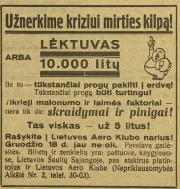 ![]() Tema: Senos reklamos Metai: 1932 Šaltinis: „Lietuvos ūkininkas“ Tekstas: Užnerkime kriziui mirties kilpą! LĖKTUVAS arba 10.000 litų Be to — tūkstančiai progų pakilti į erdvę! Tūkstančiai progų būti turtingu! Tikrieji malonumo ir laimės faktoriai — tėra tik du: skraidymai ir pinigai! Tas viskas už 5 litus! Daugiau senų reklamų | Senos Vilniaus nuotraukos Kitos senos reklamos