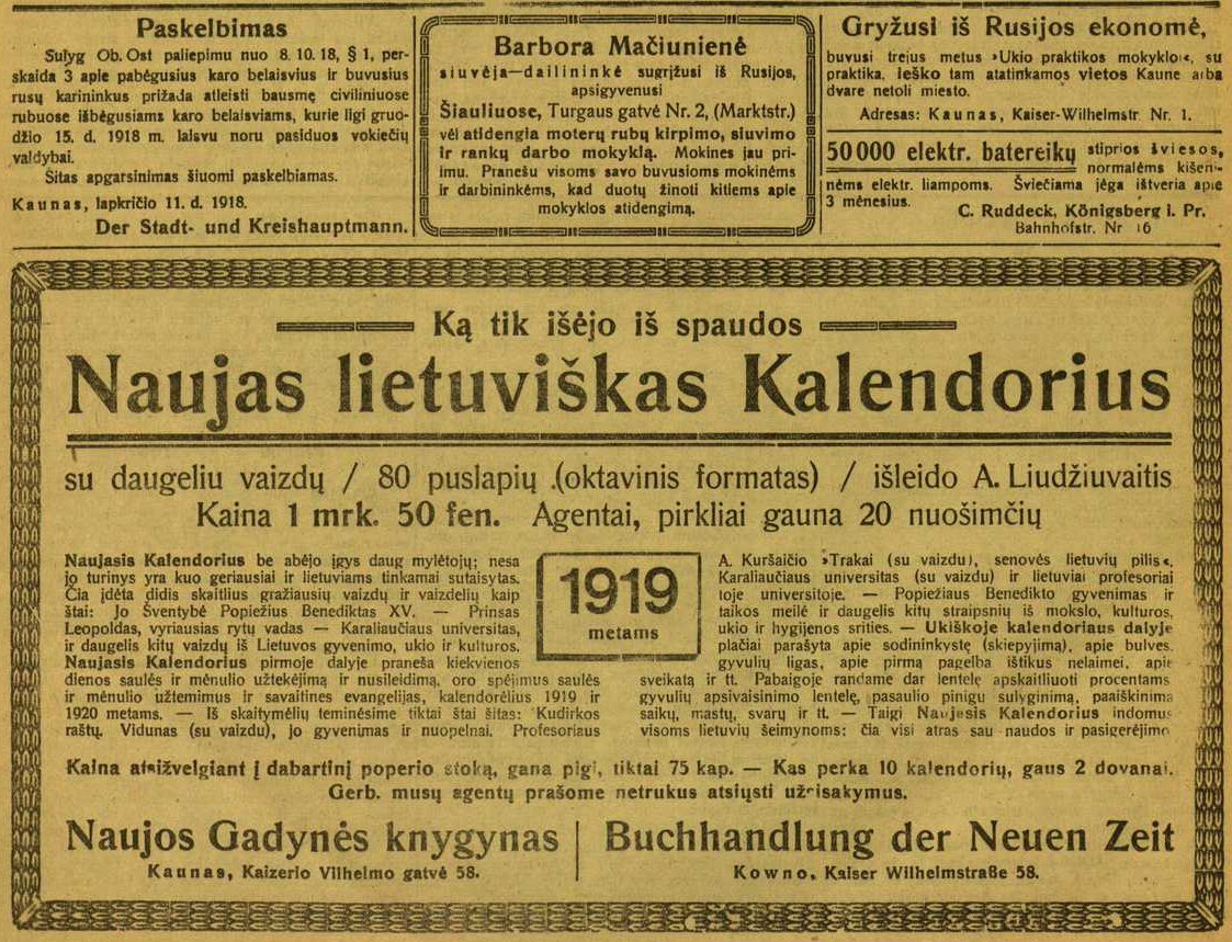 ![]() Tema: Senos reklamos Metai: 1918 Šaltinis: „Nauja gadynė“ Tekstas: Ką tik išėjo iš spaudos Naujas lietuviškas Kalendorius su daugeliu vaizdų / 80 puslapių (oktavinis formatas) / išleido A. Liudžiuvaitis. Kaina 1 mrk. 50 fen. Agentai, pirkliai gauna 20 nuošimčių Naujasis Kalendorius be abejo įgys daug mylėtojų; nes jo turinys yra kuo geriausiai ir lietuviams tinkamai sutaisytas. Čia įdėta didis skaitlius gražiausių vaizdų ir vaizdelių kaip štai: Jo Šventybė Popiežius Benediktas XV. - Princas Leopoldas, vyriausias rytų vadas — Karaliaučiaus universitas, ir daugelis kitų vaizdų iš Lietuvos gyvenimo, ūkio ir kultūros. Naujasis Kalendorius pirmoje dalyje praneša kiekvienos dienos saulės ir mėnulio užtekėjimą ir nusileidimą, oro spėjimus, saulės ir mėnulio užtemimus ir savaitines evangelijas, kalendorėlius 1919 ir 1920 metams. — Iš skaitymėlių teminėsime tiktai štai šitas: Kudirkos raštų, Vidūnas (su vaizdu), jo gyvenimas ir nuopelnai. Profesoriaus A. Kuršaičio „Trakai (su vaizdui, senovės lietuvių pilis“, Karaliaučiaus universitas (su vaizdu) ir lietuviai profesoriai toje universitoje. — Popiežiaus Benedikto gyvenimas ir taikos meilė ir daugelis kitų straipsnių iš mokslo, kultūros, ūkio ir hygijenos srities. — Ūkiškoje kalendoriaus dalyje plačiai parašyta apie sodininkystę (skiepijimą), apie bulves, gyvulių ligas, apie pirmą pagelbą ištikus nelaimei, apie sveikatą ir t.t. Pabaigoje randame dar lentelę apskaitliuoti procentams, gyvulių apsivaisinimo lentelę, pasaulio pinigų sulyginimą, paaiškinimą saikų, mastų, svarų ir t.t. — Taigi Naujasis Kalendorius indomus visoms lietuvių šeimynoms: čia visi atras sau naudos ir pasigerėjimo. Kaina atsižvelgiant į dabartinį poperio stoką, gana pigi, tiktai 75 kap. — Kas perka 10 kalendorių, gaus 2 dovanai. Gerb. mūsų agentų prašome netrukus atsiųsti užsisakymus. Naujos Gadynės knygynas. Kaunas, Kaizerio Vilhelmo gatvė 58. Buchhandlung der Neuen Zeit. Kowno. Kaiser Wilhelmstraße 58. Daugiau senų reklamų | Senos Vilniaus nuotraukos Kitos senos reklamos