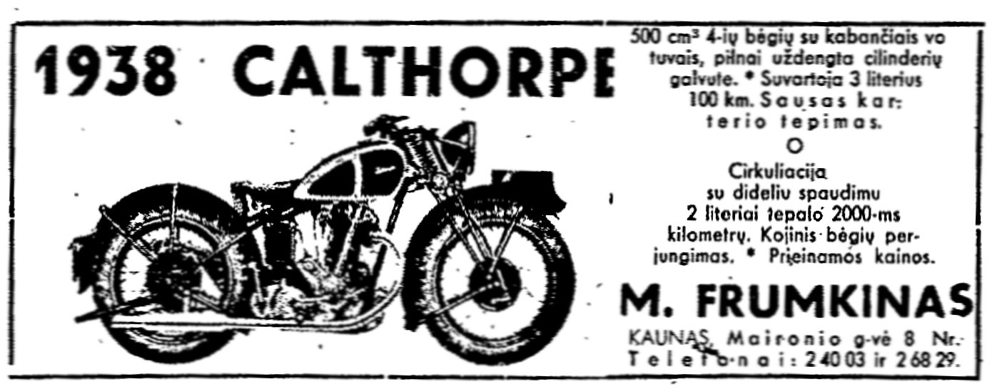 ![]() Tema: Senos reklamos Metai: 1938 Šaltinis: „Geležinkelininkas“ Tekstas: 1938 CALTHORPE 500 cm3 4-ių bėgių su kabančiais vožtuvais, pilnai uždengta cilinderių galvute Suvartoja 3 literius 100 km Sausas karterio tepimas Cirkuliacija su dideliu spaudimu 2 literiai tepalo 2000-ms kilometrų Kojinis bėgių perjungimas Praeinamos kainos M. FRUMKINAS KAUNAS, Maironio g-vė 8 Nr. Daugiau senų reklamų | Senos Vilniaus nuotraukos Kitos senos reklamos