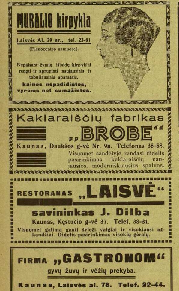 ![]() Tema: Senos reklamos Metai: 1933 Šaltinis: „Mūsų Vilnius“ Tekstas: Muralio kirpykla Kaunas, Laisvės Al. 29 nr. Nepaisant žymių išlaidų kirpyklai rengti ir aprūpinti naujausiais ir tobuliausiais aparatais, Kainos nepadidintos vyrams net sumažintos. Daugiau senų reklamų | Senos Vilniaus nuotraukos Kitos senos reklamos