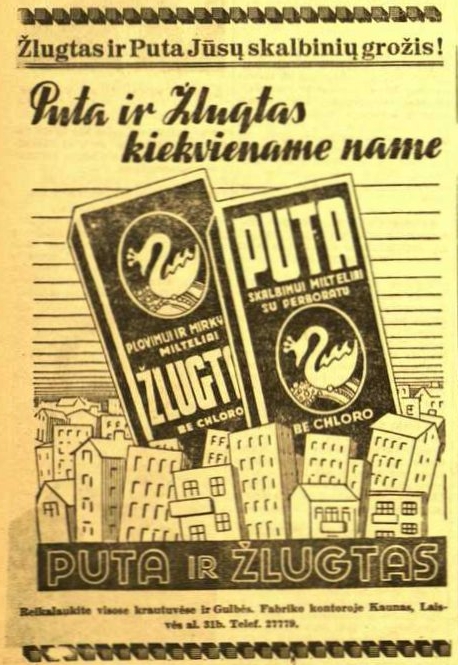 ![]() Tema: Senos reklamos Metai: 1940 Šaltinis: „Mūsų laikraštis“ Tekstas: Žlugtas ir Puta – Jūsų skalbinių grožis! Puta ir Žlugtas kiekviename name Daugiau senų reklamų | Senos Vilniaus nuotraukos Kitos senos reklamos