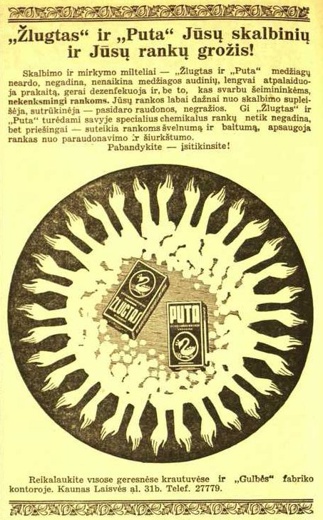![]() Tema: Senos reklamos Metai: 1940 Šaltinis: „Mūsų laikraštis“ Tekstas: „Žlugtas“ ir „Puta“ – Jūsų skalbinių ir Jūsų rankų grožis Daugiau senų reklamų | Senos Vilniaus nuotraukos Kitos senos reklamos