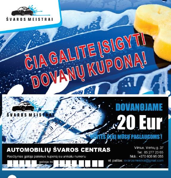Veiklos sritys: Veiklos aprašymas: Bendrovė subūrė komandą jaunų, inovatyvių žmonių, siekdama žengti su naujausiomis technologijomis į ateitį. Viena iš šių naujovių, tai automobilio plovimas nano technologijomis. Pažangių technologijų dėka galime tobulėti ir nestovėti vietoje, todėl mūsų tikslas pasidalinti šia naujove su Jumis. Mūsų paslaugos: Automobilių plovimas rankomis, vaškavimas ir sausinimas; Automobilių valymas; Vilkikų valymas, plovimas, autobusų plovimas, vaškavimas ir sausinimas; Automobilių dugno plovimas; Motociklų plovimas, kitos smulkios technikos plovimas; Automobilio salono sausas valymas, cheminis valymas, dezinfekavimas; Automobilio kėbulo šlifavimas, automobilio poliravimas, automobilio vaškavimas; Automobilio padengimas nano danga, keramik danga, sonax nano hibridine danga, teflonu; Automobilių įbrėžimų dažymas, šlifavimas, poliravimas; Variklio plovimas; Automobilių variklių plovimas iš apačios; Diskų valymas, atnaujinimas; Salono valymas, plastikinių, polimerinių dangų valymas, atnaujinimas; Guminių detalių valymas, atnaujinimas; Odinio salono cheminis valymas, odos losjono padengimas; Odos dažymas, atnaujinimas; Bitumo valymas; Kalkių valymas nuo automobilio; Kelio apnašų valymas, smalos valymas, dervų valymas, sakų valymas; Lipdukų nuėmimas, klijų valymas; Stiklo šlifavimas-poliravimas; Kalkių valymas nuo automobilio stiklo; Langus tamsinančios plėvelės šalinimas; UAB “ŠVAROS MEISTRAI” atlieka patalpų valymo paslaugas: Individualių namų, naujos statybos, patalpų po remonto ar perkraustymo, pilnas valymas Klientų pageidavimu UAB “ŠVAROS MEISTRAI” automobilių švaros centras pradėjo naujų paslaugų teikimą: kilimų, kiliminių dangų (reikia atvežti į automobilių plovyklą Vilniuje) plovimas ir valymas, krovininių automobilių plovimas, salono cheminis valymas, sunkvežimių plovimas, autobusų plovimas, salono valymas. UAB “ŠVAROS MEISTRAI” visuomet pasiruošę Jums padėti. Patyrę darbuotojai Jūsų automobiliui pasiūlys viską kas geriausia. Maloniai Kviečiame Apsilankyti Mūsų Automobilių Plovykloje Vilniuje.